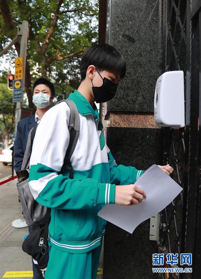 4月27日,广州市第二中学的学生在入校前清洁双手。 当日,广州市初三高三年级返校。 新华社记者 卢烨 摄