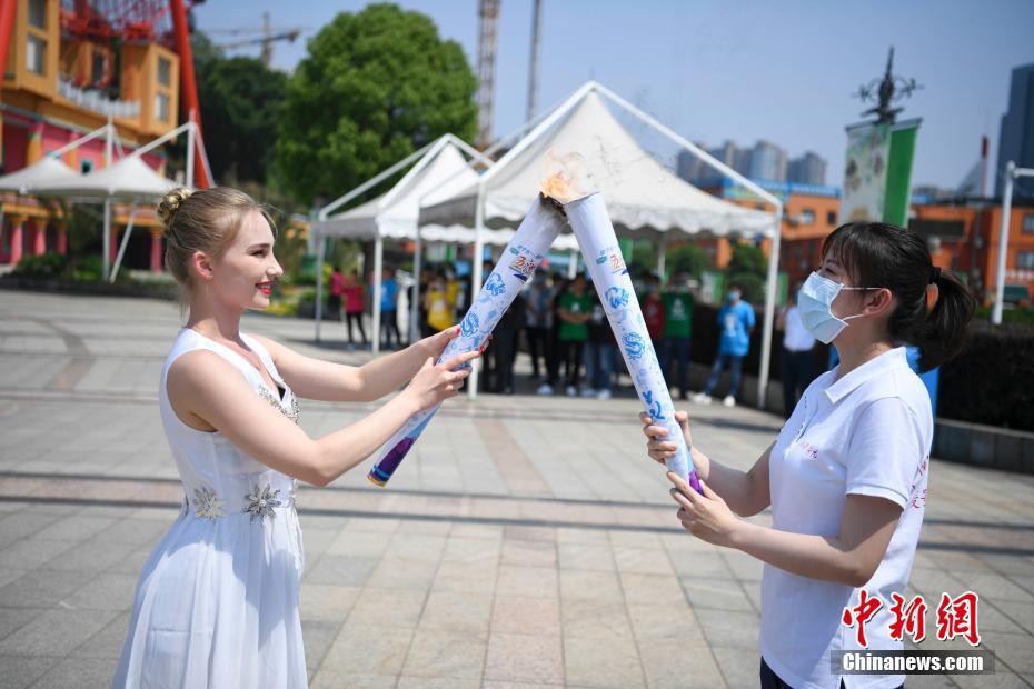 4月28日,驰援湖北的护士段凝(右)进行火炬传递。当日,以“五洲奥运会”为主题的趣味运动会在湖南长沙世界之窗举行。中新社记者 杨华峰 摄