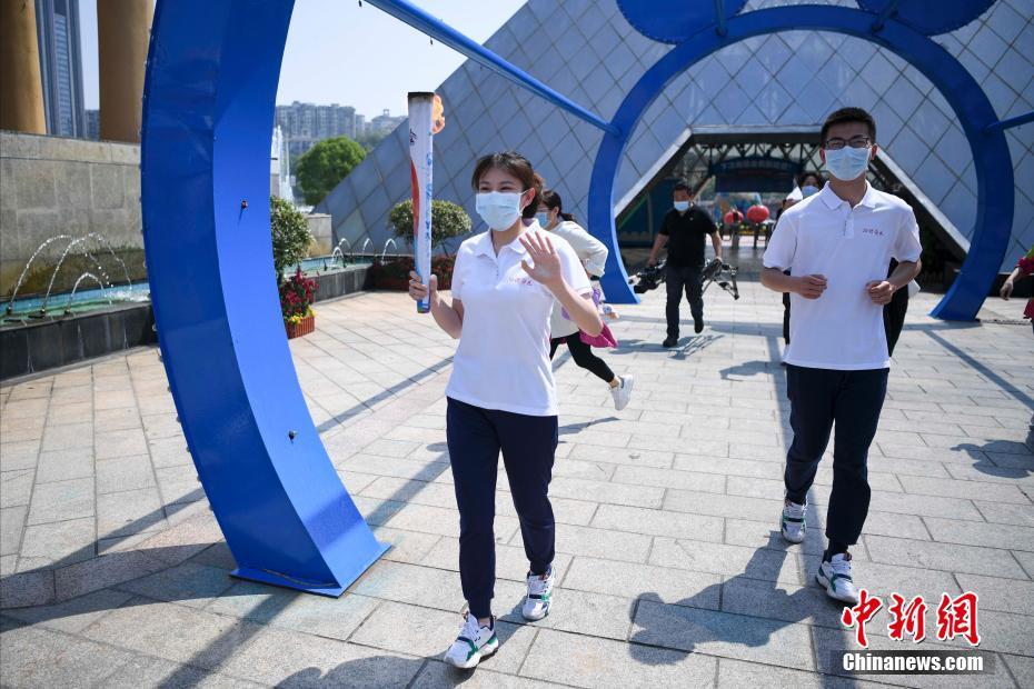 4月28日,驰援湖北的护士段凝手持火炬跑步。当日,以“五洲奥运会”为主题的趣味运动会在湖南长沙世界之窗举行。中新社记者 杨华峰 摄