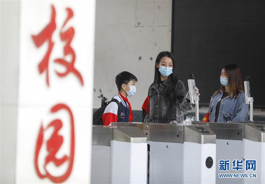 5月8日,河南省平顶山市宝丰县西城门小学学生在入校时接受体温测量。 当日,河南省平顶山市小学五、六年级复课。 新华社发(何五昌 摄)