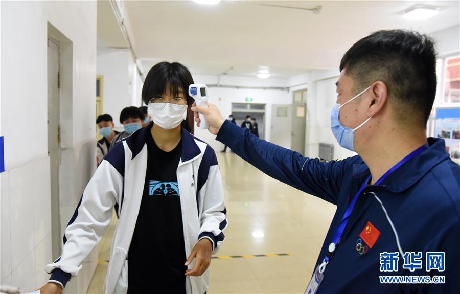 5月8日,山东省济南市体育运动学校学生陈佳颀(左)在进入班级前接受体温检测。 当日,山东省济南市体育运动学校初中毕业年级正式复学复课。为保障师生健康安全和复学复课顺利进行,学校不仅要求进行行李消杀、体温检测和健康码出示,还要求学生上课和用餐时间隔就座、间隔行走,在防控疫情的基础上有序复学复课。 新华社记者王凯摄