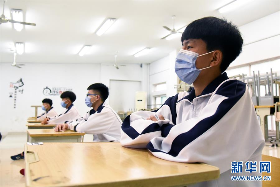 5月8日,山东省济南市体育运动学校学生王德齐(右一)在班会上听老师讲解防疫知识和复学复课后的作息安排。 当日,山东省济南市体育运动学校初中毕业年级正式复学复课。为保障师生健康安全和复学复课顺利进行,学校不仅要求进行行李消杀、体温检测和健康码出示,还要求学生上课和用餐时间隔就座、间隔行走,在防控疫情的基础上有序复学复课。 新华社记者王凯摄