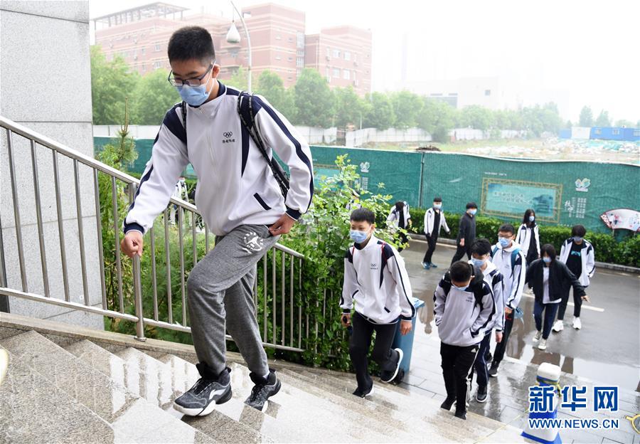 5月8日,山东省济南市体育运动学校初中毕业年级的学生间隔一米有序排队到食堂就餐。 当日,山东省济南市体育运动学校初中毕业年级正式复学复课。为保障师生健康安全和复学复课顺利进行,学校不仅要求进行行李消杀、体温检测和健康码出示,还要求学生上课和用餐时间隔就座、间隔行走,在防控疫情的基础上有序复学复课。 新华社记者王凯摄