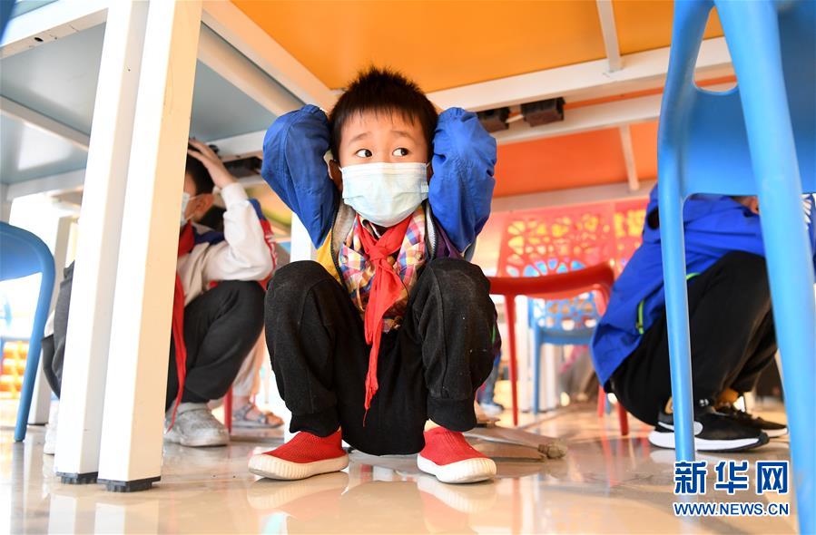 5月10日,合肥市淝南社区的儿童在进行地震防灾应急避险演练。 第12个全国防灾减灾日临近,合肥市包河区常青街道淝南社区开展防灾减灾主题活动,向辖区儿童普及防灾减灾知识,提高避险自救能力。 新华社记者 刘军喜 摄