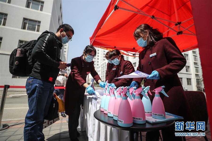 5月10日,东北大学的返校学生在宿舍前进行信息核对,领取消毒液。 5月8日为辽宁省高校返校复学起始时间,省内各大高校按照先省外后省内、先毕业年级后其他年级原则,分批错峰安排学生返校。返校的外省学生在进行各项检查、信息核实登记后,将在指定的宿舍楼进行隔离观察,隔离期满后开始正常学习生活。 新华社记者 潘昱龙 摄