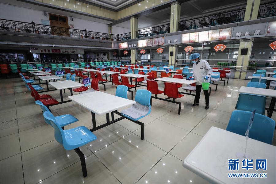 5月10日,工作人员在东北大学食堂内进行消毒。 5月8日为辽宁省高校返校复学起始时间,省内各大高校按照先省外后省内、先毕业年级后其他年级原则,分批错峰安排学生返校。返校的外省学生在进行各项检查、信息核实登记后,将在指定的宿舍楼进行隔离观察,隔离期满后开始正常学习生活。 新华社记者 潘昱龙 摄