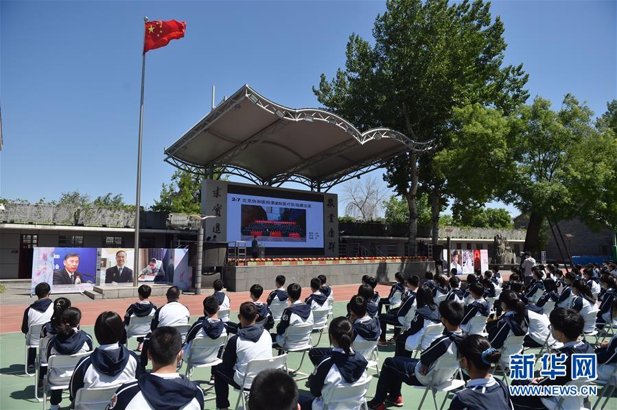 5月11日,在北京市第一六六中学,北京协和医院援鄂医疗队队员分享在武汉抗疫期间的经历和感受。 当日,北京市初三年级学生开学复课。北京市第一六六中学初三年级全体师生参加主题为“青春有梦,奋斗有我”的2020年春季学期“开学第一课”,邀请北京协和医院援鄂医疗队队员分享抗疫经历和感受。 新华社记者 彭子洋 摄