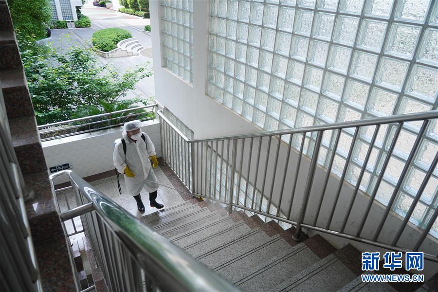5月13日,工作人员在南昌市红谷滩新区碟子湖学校公共区域进行消杀。新华社记者 周密 摄