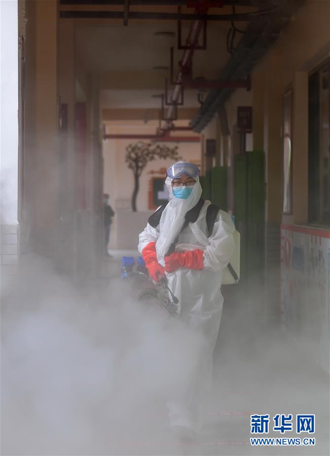 5月14日,在湖北省恩施土家族苗族自治州恩施思源实验学校,志愿者对走廊进行消杀作业。 连日来,志愿者在湖北省恩施土家族苗族自治州恩施市城乡各中小学进行全面消杀作业,为学生复课做准备。 新华社发(杨顺丕 摄)