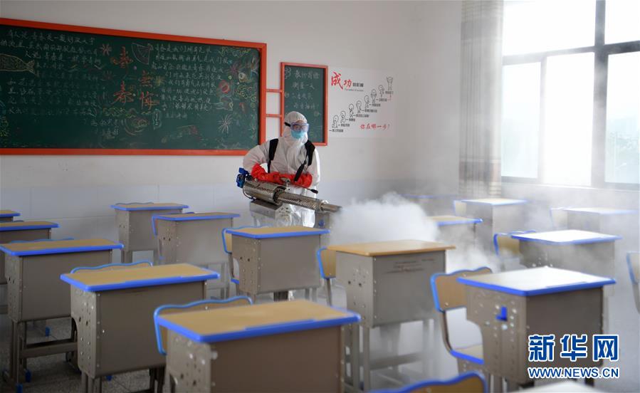 5月14日,在湖北省恩施土家族苗族自治州恩施思源实验学校,志愿者对教室进行消杀作业。 连日来,志愿者在湖北省恩施土家族苗族自治州恩施市城乡各中小学进行全面消杀作业,为学生复课做准备。 新华社发(杨顺丕 摄)