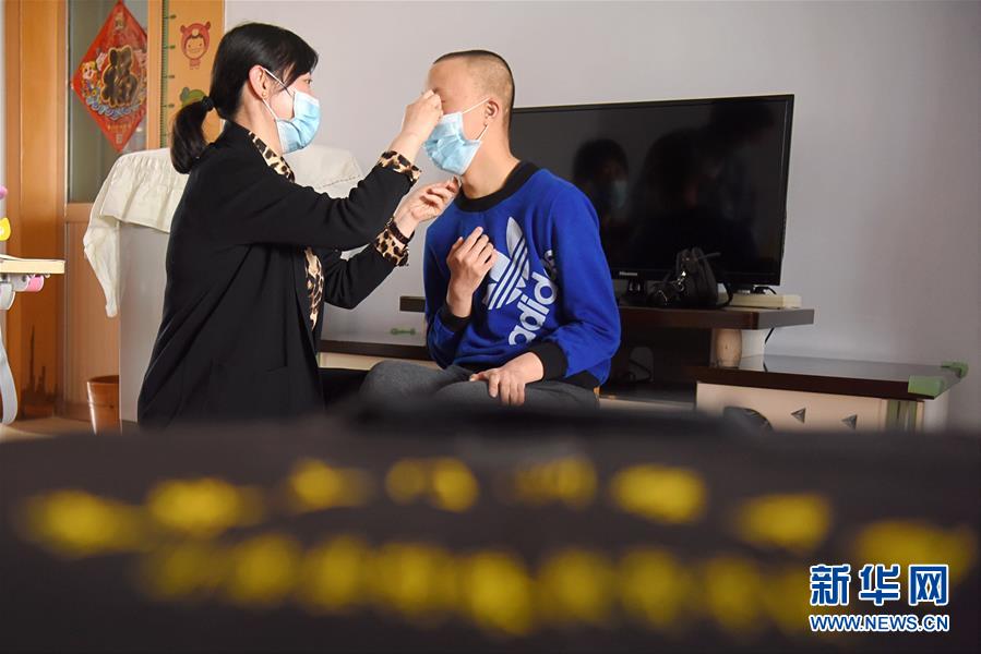5月13日,在山东省淄博市沂源县南麻街道一社区,送教老师帮一名残疾孩子整理口罩。新华社发(赵东山 摄)