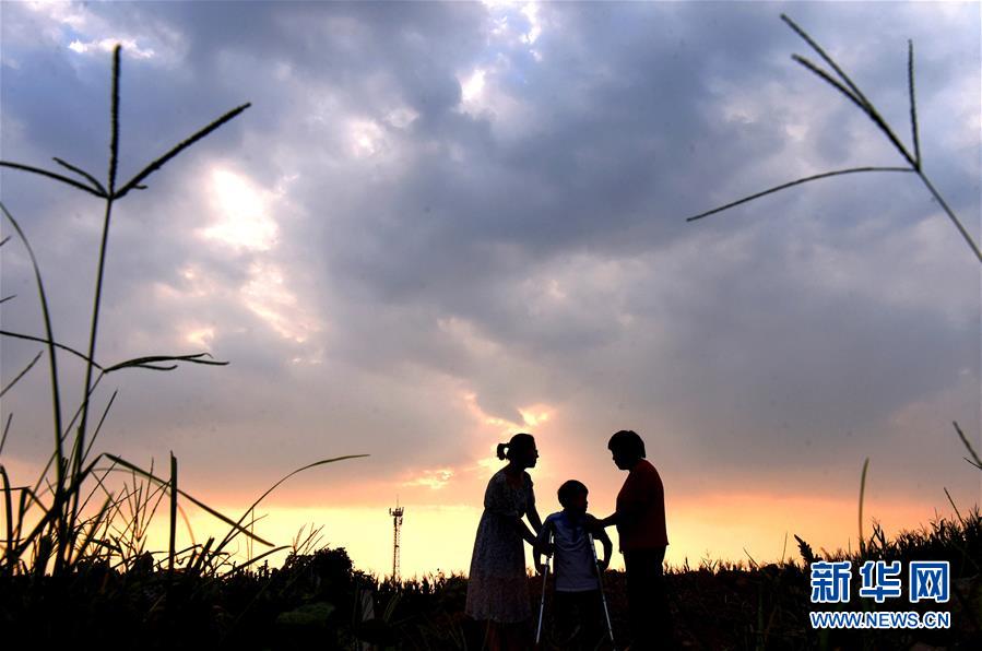 在山东省淄博市沂源县,送教老师帮助一名不能入校的残疾孩子练习拄拐行走(2019年9月7日摄)。新华社发(赵东山 摄)