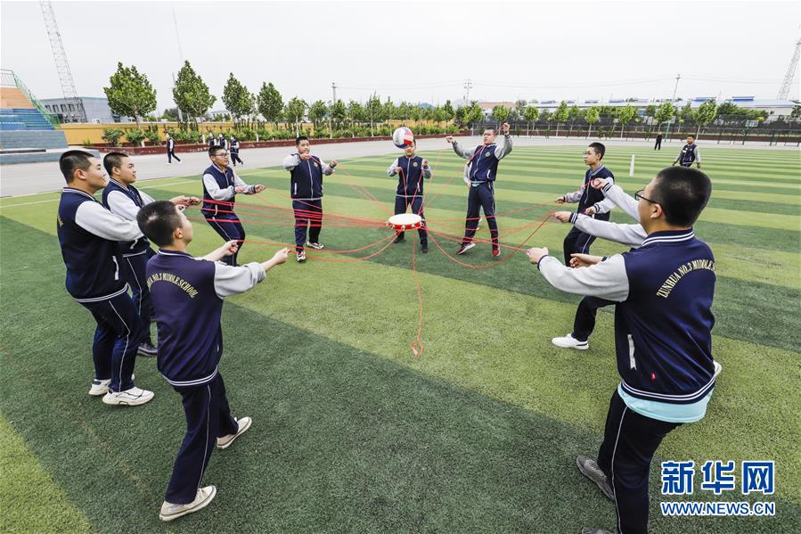 5月17日,河北唐山遵化市第三中学九年级学生在操场做游戏。