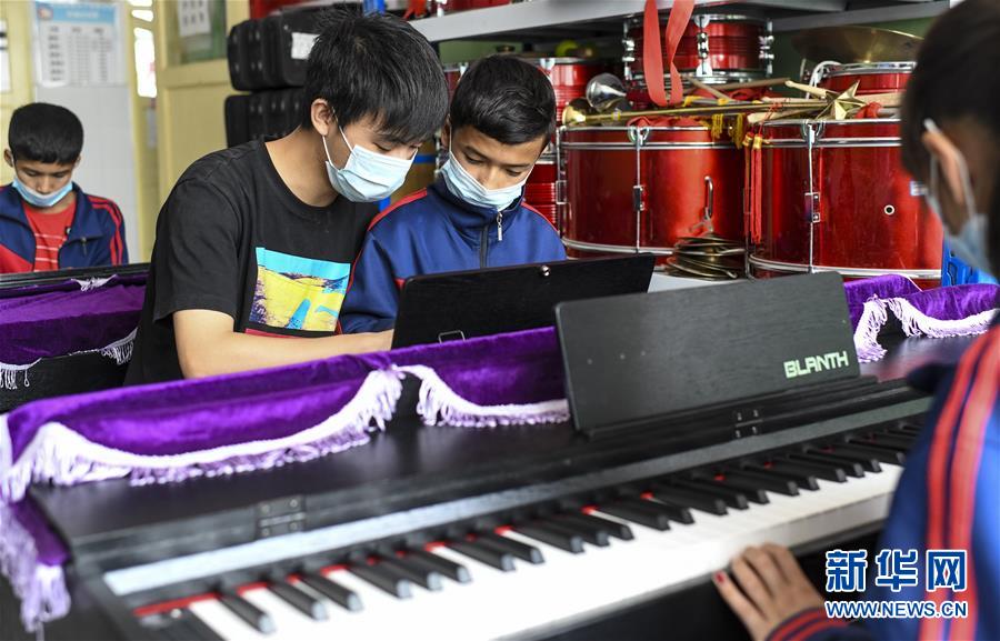 5月16日,在新疆和田县塔瓦库勒乡巴克墩小学,学生们在支教老师蒋锐(左二)的指导下练习弹钢琴。新华社记者 王菲 摄