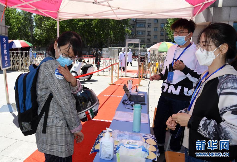 5月18日,山东大学返校学生(左)在进行入校登记。新华社记者 王凯 摄