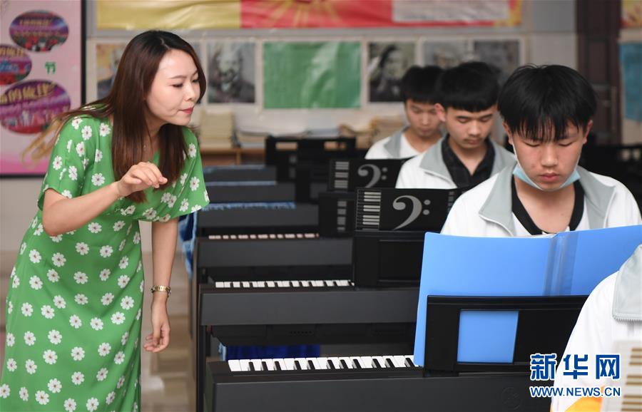 5月22日,泸溪县第五中学的老师(左)在给学生上钢琴课。 泸溪县第五中学位于湖南省湘西土家族苗族自治州泸溪县武溪镇,是一所农村普通完全中学。学校自2006年起免费开设各类艺术培训课,培养农村学生的艺术兴趣、专业特长。 新华社记者 薛宇舸 摄