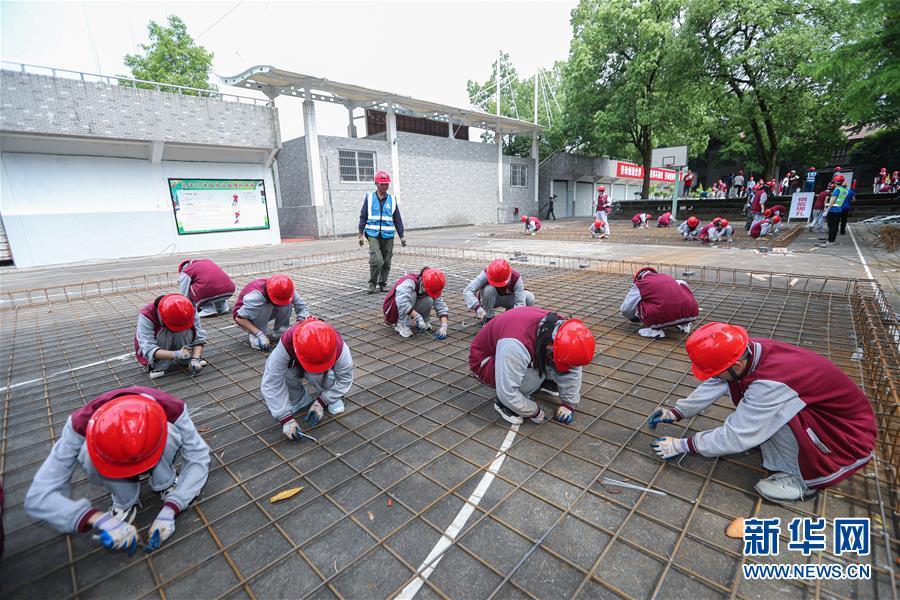 5月23日,学生们在土木园内参加劳动实践课,体验钢筋绑扎。 当日,在位于浙江省建德市梅城古镇的浙江省严州中学内,包括农耕园、果乐园、工艺园、土木园和微创园等在内的校园劳动基地亮相,高一年级400多名师生开启了各具特色的劳动实践,标志着该学校劳动教育实践活动的全面实施,开启劳动教育“必修课”模式。严州中学把劳动教育课分为“生产性劳动、服务性劳动、智慧性劳动”三大模块,让孩子们体验劳动实践、掌握生活技能、培养劳动素养。 今年3月,中共中央、国务院印发了《关于全面加强新时代大中小学劳动教育的意见》,就加强新时代大中小学劳动教育提出了意见,要在大中小学设立劳动教育必修课程。 新华社记者 徐昱 摄