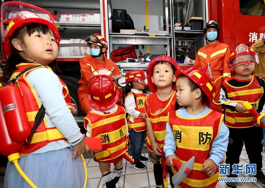 5月30日,小朋友们参观消防设备。 当日,上海市长宁区消防救援支队营区举行迎“六一”消防家庭日活动,消防员的亲属和子女走进消防战位,学习消防知识,感受消防员的光荣使命。 新华社记者 陈飞 摄