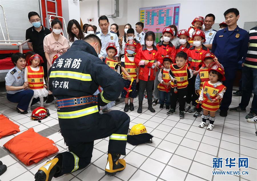 5月30日,小朋友们观看消防员快速穿着战斗服。 当日,上海市长宁区消防救援支队营区举行迎“六一”消防家庭日活动,消防员的亲属和子女走进消防战位,学习消防知识,感受消防员的光荣使命。 新华社记者 陈飞 摄