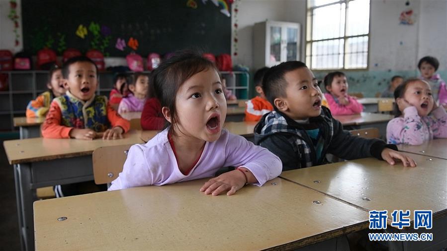 广西融水苗族自治县东阳村小学一年级学生在跟随老师拼读汉语拼音(2019年5月6日摄)。 新华社记者 张爱林 摄