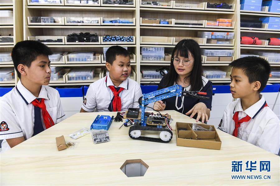 广西兴业县城西小学的老师(右二)给学生讲解机器模型的有关知识(5月29日摄)。 新华社记者 曹祎铭 摄