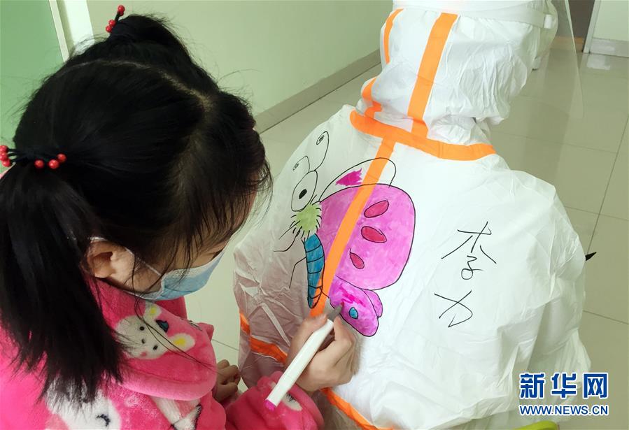 湖北武汉,隔离病房内,小女孩在医生的防护服上绘画(资料图片)。