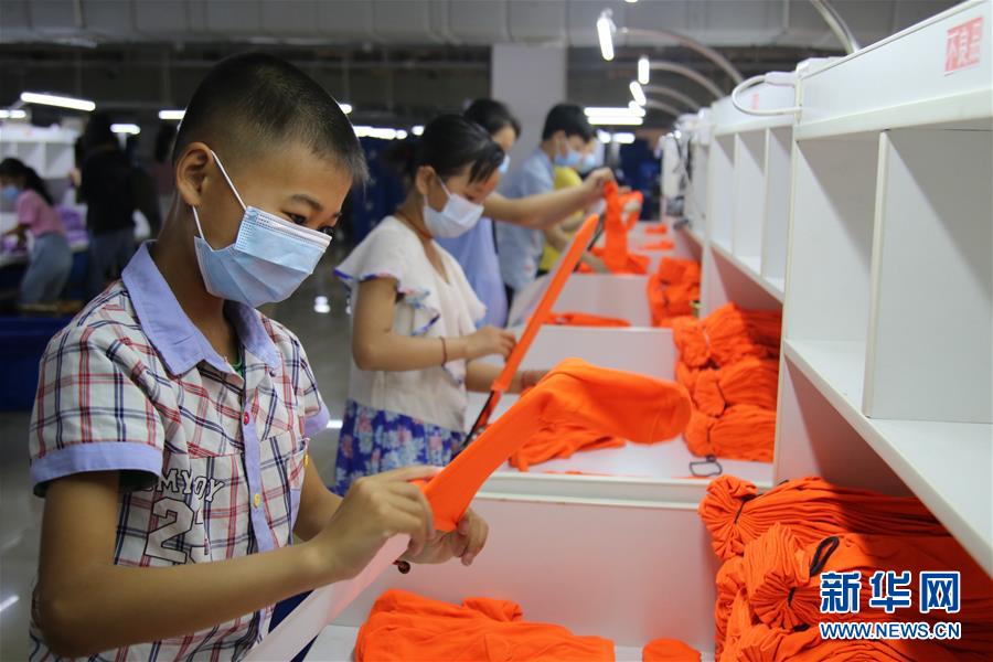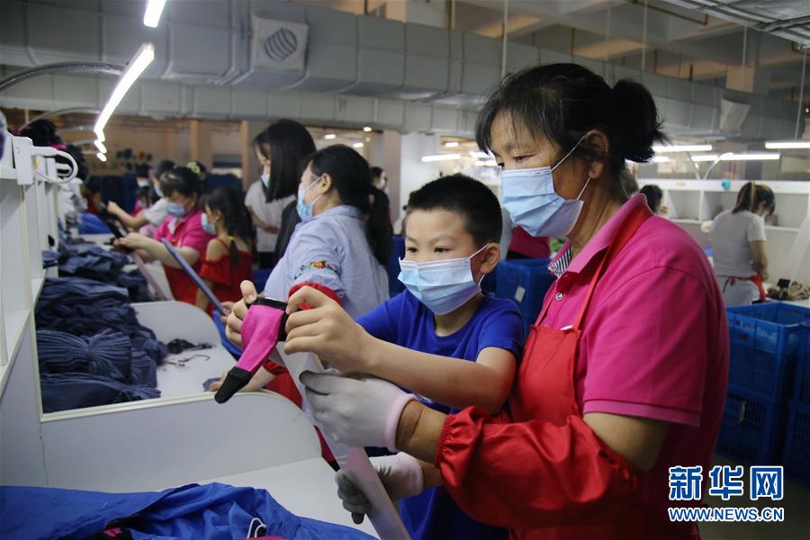 6月1日,孩子们在郧阳区杨溪铺镇青龙泉社区一家袜业扶贫车间体验翻袜子。新华社发(曹忠宏 摄)