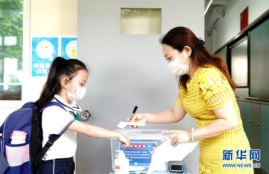6月2日,上海闵行区鑫都小学的学生走进校园。 当日,上海小学一、二、三年级学生返校开学。 新华社记者 张建松 摄