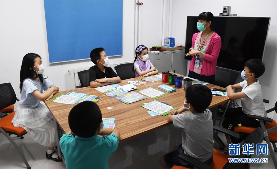 在北京市海淀区中关村街道新科祥园社区服务站,“绿色明天”环保志愿小队队员们学习垃圾分类知识(5月28日摄)。新华社记者 任超 摄