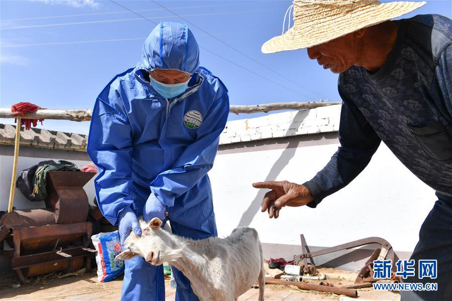 6月10日,“农牧民夜校”讲师团成员、杭锦旗动物疫病预防控制中心的工作人员何荣利(左)在巴拉贡镇朝凯村为村民检查山羊健康状况。