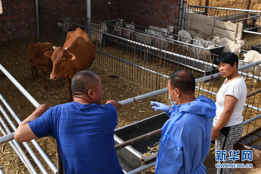 6月10日,“农牧民夜校”讲师团成员、杭锦旗动物疫病预防控制中心的工作人员何荣利(中)在巴拉贡镇朝凯村与村民交流。新华社发(贝赫 摄)