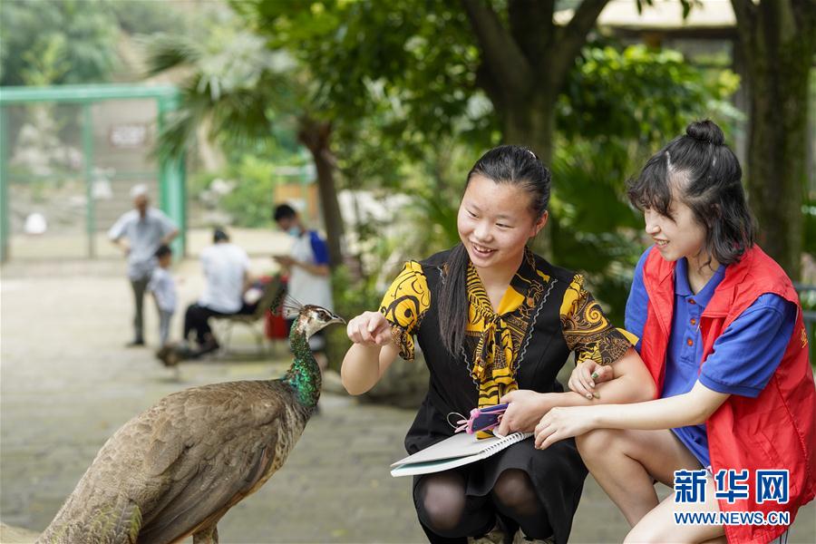 6月18日,在重庆市动物园,九龙坡区青年志愿者徐小娇(右一)陪着聋哑女孩萍萍(左一)近距离观赏孔雀。 新华社记者 刘潺 摄