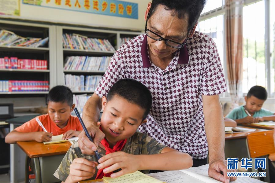 6月19日,在武宣县二塘镇双桂小学,韦旭禧纠正学生握笔姿势。新华社记者 曹祎铭 摄