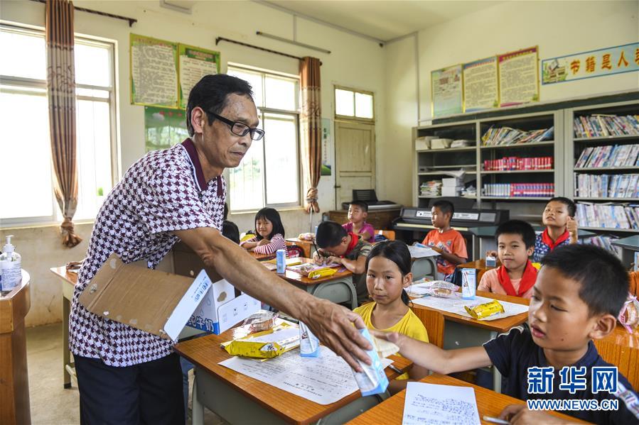 6月19日,在武宣县二塘镇双桂小学,韦旭禧给学生们发牛奶。新华社记者 曹祎铭 摄