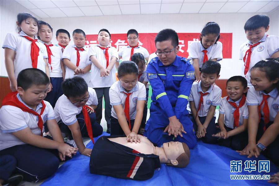 6月23日,山东青岛市即墨区蓝天救援队的志愿者为华山路小学的学生讲解心肺复苏技能。 暑假即将到来,山东青岛市即墨区华山路小学开展“珍爱生命,预防溺水”为主题的安全教育活动,邀请蓝天救援队志愿者走进课堂,通过宣讲防溺水常识、教授安全急救技能、开展实例警示教育等形式,提高孩子们的安全意识和自救能力。 新华社发(梁孝鹏 摄)