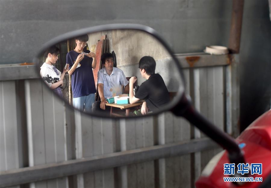 6月24日,创业团队成员与诸暨市同山镇酿酒户寿科军(右二)交流直播营销事宜。 新华社记者韩传号摄