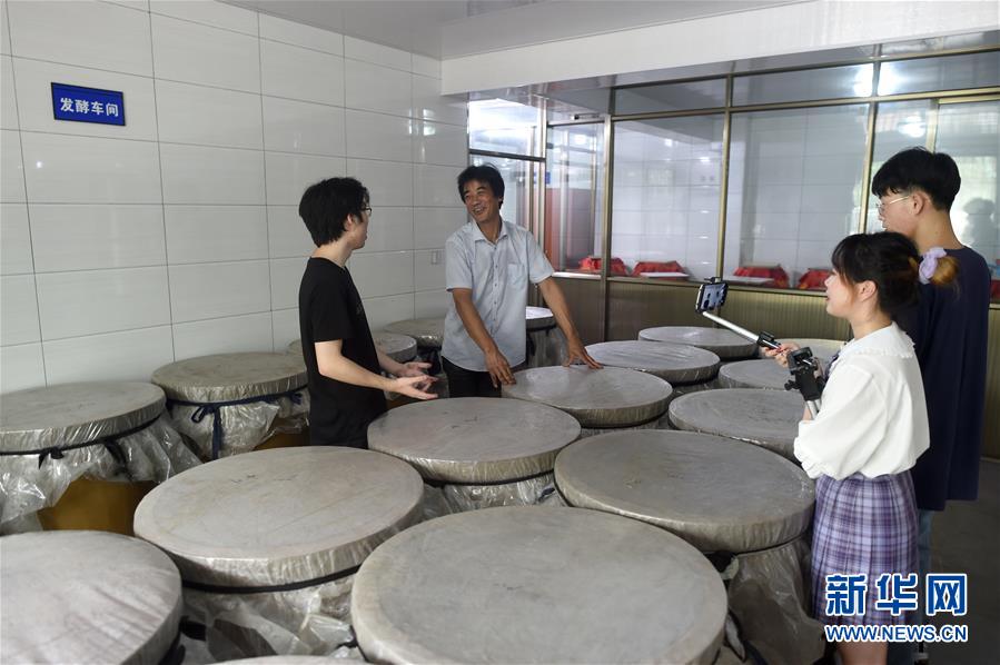 6月24日,创业团队成员在诸暨市同山镇酿酒户寿科军(左二)家拍摄视频素材。 新华社记者韩传号摄