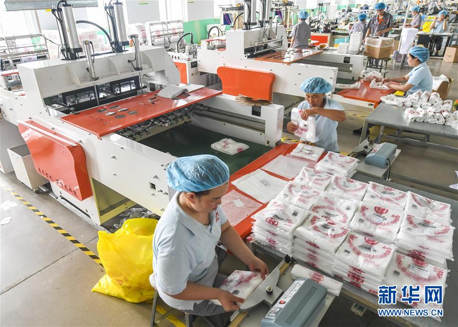 6月26日,在河北省故城县一家食品包装企业,工人在操作全自动制袋机制作环保食品包装袋。 近年来,河北省故城县积极引导传统产业向高质、智能、环保转型升级,着力打造环保食品包装产业基地。目前,全县已引进包装企业120余家。 新华社记者李晓果摄