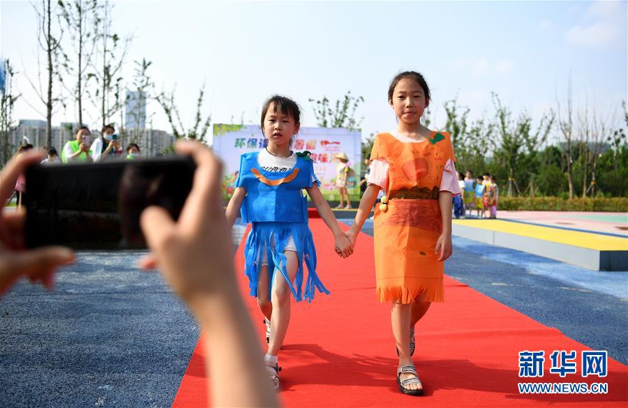 7月3日,油坊岗社区小朋友在展示“环保时装”。 当日,安徽省合肥市常青街道油坊岗社区开展“暑期环保课堂”主题活动,通过开展环保时装秀、垃圾分类环保小游戏等活动,帮助孩子们从小树立节约资源、爱护环境的意识。 新华社记者 刘军喜 摄