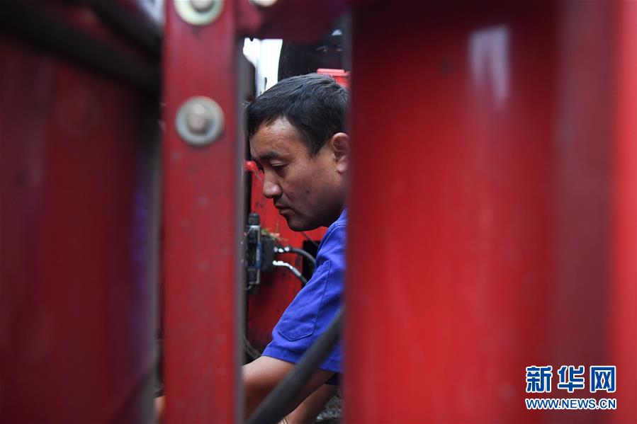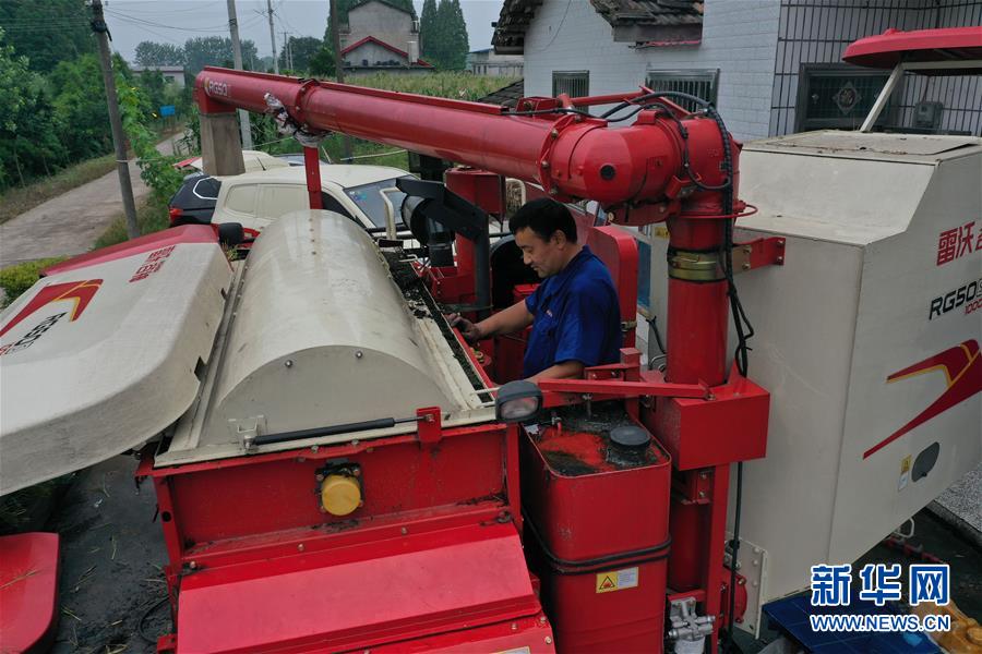7月21日,汤烈辉在南县华阁镇同兴村维修收割机。 新华社记者 薛宇舸 摄