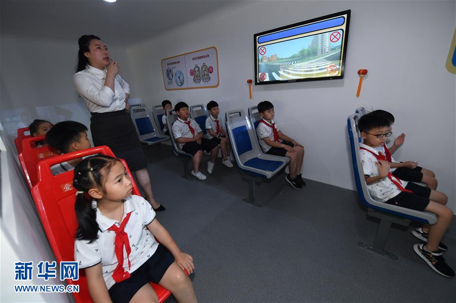 7月23日,在刚刚投入使用的织里镇公共安全教育基地内,工作人员给孩子们普及乘坐公共交通时需要掌握的安全知识。 新华社记者 徐昱 摄