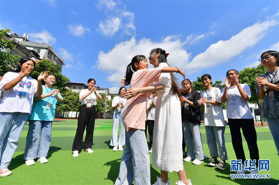 在融水苗族自治县保桓中学1813班举办的送别班会上,支教老师林洋港(中右)和同学们拥抱告别(7月23日摄)。新华社记者 黄孝邦 摄