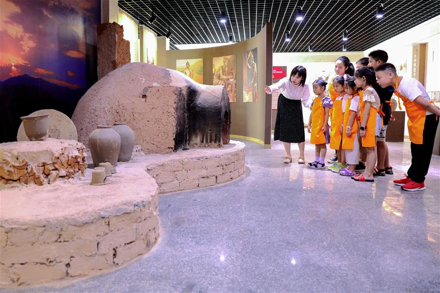 7月24日,在长兴县林城镇方山窑村,孩子们在青年志愿者的带领下参观当地窑址展览馆。新华社记者 徐昱 摄