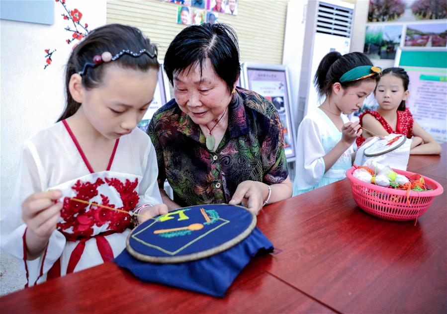 7月24日,在长兴县林城镇连心村,孩子们在传统手艺人的指导下学习刺绣。新华社记者 徐昱 摄