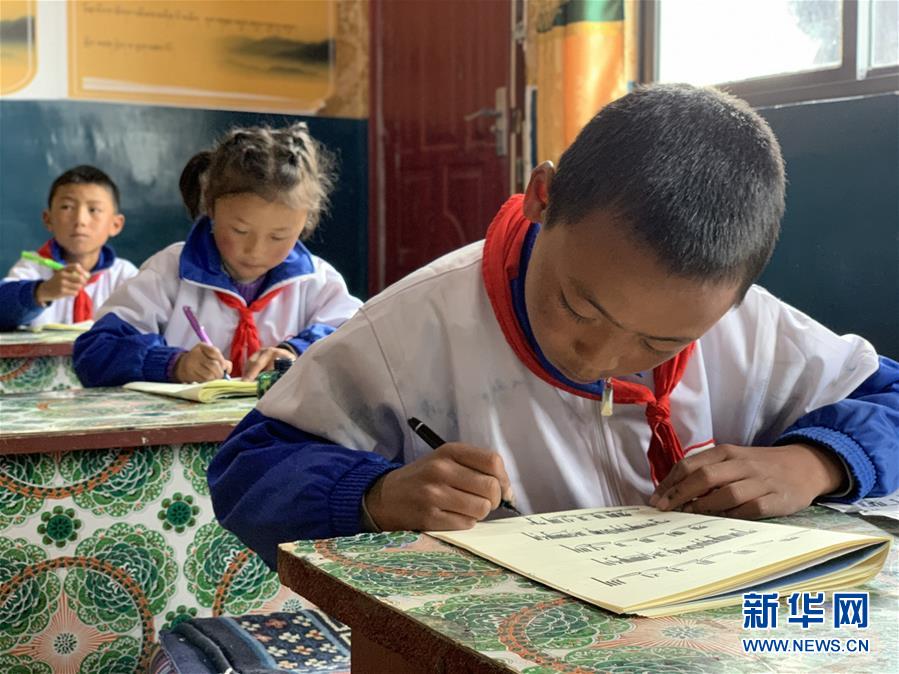 拉孜乡中心小学学生在练习藏文书法(7月29日摄)。新华社记者 唐弢 摄