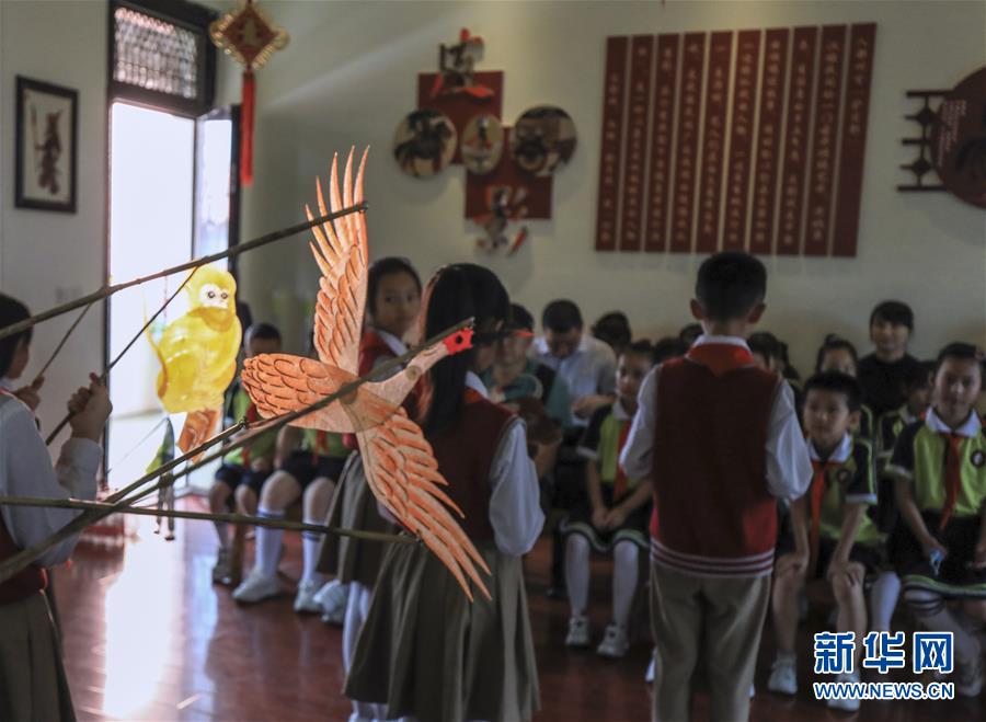 7月31日,洋县青年路小学的小朋友们在校园皮影小舞台练习皮影技艺。 近年来,陕西省汉中市洋县为了让中小学生直观、生动地认识并了解中华优秀传统文化,零距离感受非遗文化的魅力,常年利用节假日和寒暑假时间开展“非遗进校园”活动,长期聘请校外艺术教育专家和地方民间艺人,定期到校为师生做报告,举办传承项目培训、成果展示等,对师生进行传、帮、带,为非遗表演爱好者提供了施展才华的园地,也为校园文化的创建增添了一抹鲜艳的色彩。 新华社记者 兰红光 摄