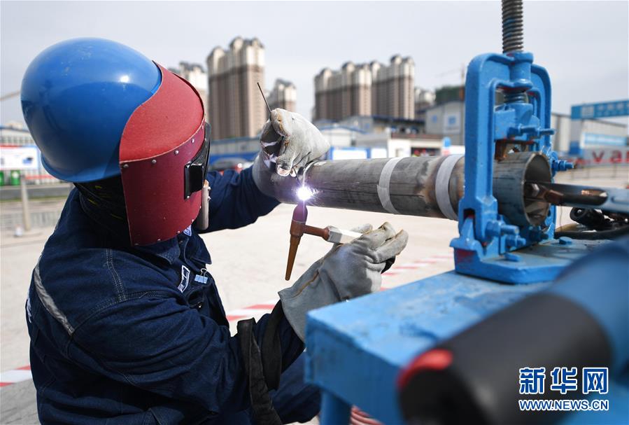 8月3日,工人在参加焊接项目的比拼展示。 当日,中建二局有限公司在石家庄市一处工地举办2020年职工技能才艺展示暨一线工人“技能明星”大比武活动。20余名一线工人分别参加钢筋、焊接、砌筑、机电、塔吊等项目的展示与比拼。 新华社记者 朱旭东 摄