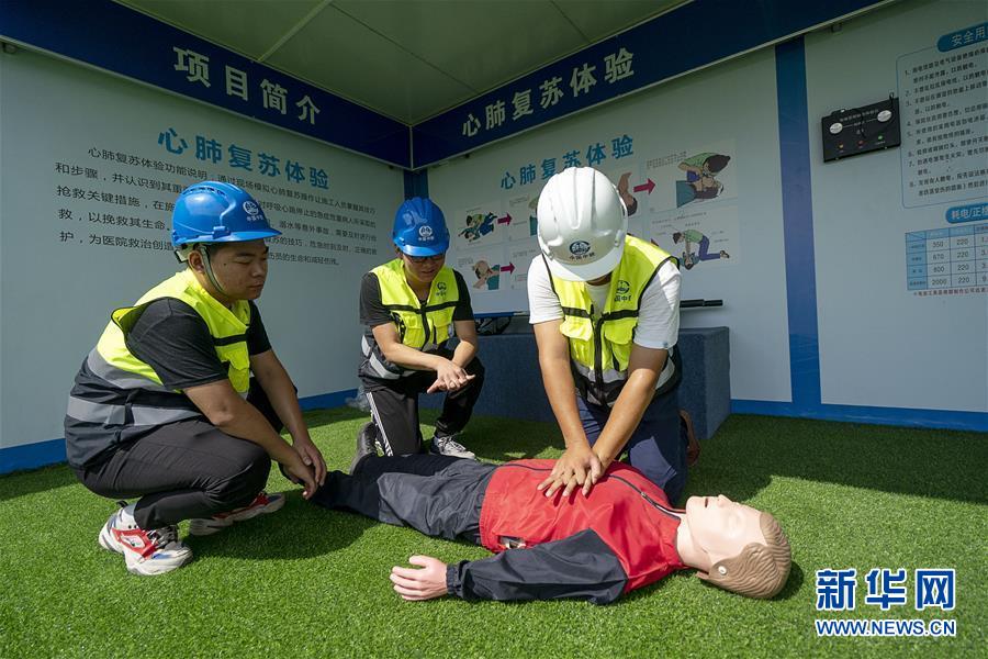 8月6日,工人在开展安全技能培训。 近日,武汉迎来持续高温天气。为保证施工安全,在武汉市黄家湖污水处理厂三期扩建工程工地,中铁市政环境建设有限公司对工人开展安全教育,通过体验VR安全体验馆、讲解安全生产知识、开展安全技能培训等,提高建筑工人的安全生产意识。 新华社记者 熊琦 摄