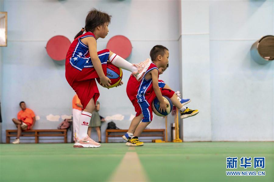 8月5日,在昆明市体育馆内,篮球培训班几名小学员在训练。 暑假期间,昆明市青少年体育俱乐部在做好防疫、确保安全和健康的前提下开办了篮球、羽毛球、空手道、跆拳道等项目培训班,孩子们通过参加体育培训班的方式丰富暑期生活,培养对体育的兴趣,增强体质。 新华社发(陈欣波摄)