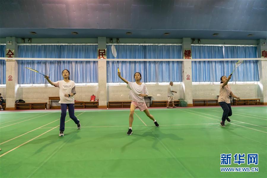 8月4日,在昆明市体育馆内,羽毛球培训班三名学员在练习挥拍。 暑假期间,昆明市青少年体育俱乐部在做好防疫、确保安全和健康的前提下开办了篮球、羽毛球、空手道、跆拳道等项目培训班,孩子们通过参加体育培训班的方式丰富暑期生活,培养对体育的兴趣,增强体质。 新华社发(陈欣波摄)